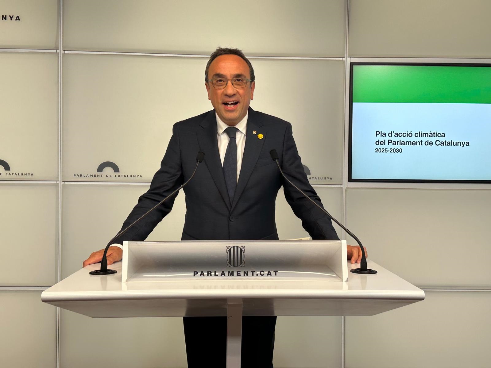 El presidente del Parlament, Josep Rull, ha presentado este lunes el plan de acción climática de la Cámara, con el objetivo de ser «neutro de carbono» en 2029, reduciendo al máximo las emisiones de gases de efecto invernadero y dotándose de herramientas de compensación en los ámbitos en los que no se puedan eliminar.