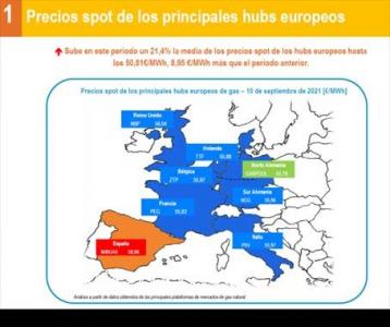 El diferencial de precios entre los hubs sube en este periodo un 7%, hasta los 2,81 euros/MWh, respecto al periodo anterior y todos los mercados europeos siguen situándose muy por encima de la fórmula indexada al Brent.