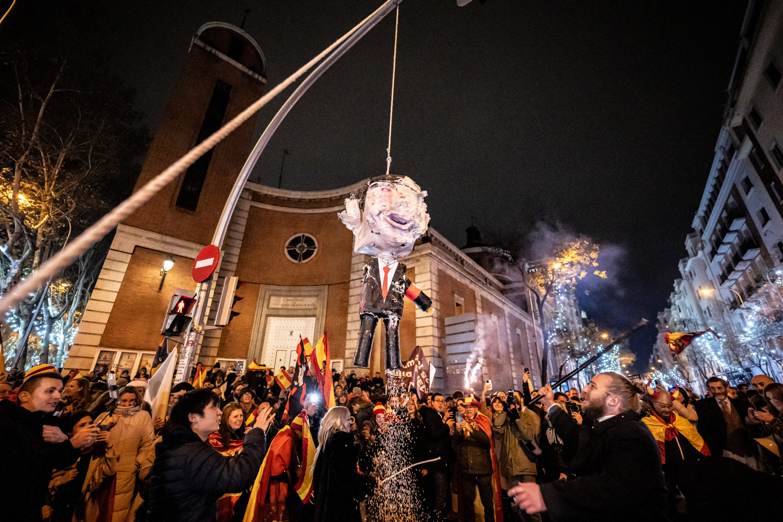 El PSOE ya había adelantado que apreciaba un posible delito de odio en la concentración, donde varios asistentes golpearon con palos un muñeco que representaba al presidente del Gobierno, Pedro Sánchez, que estaba colgado de una cuerda en un semáforo.