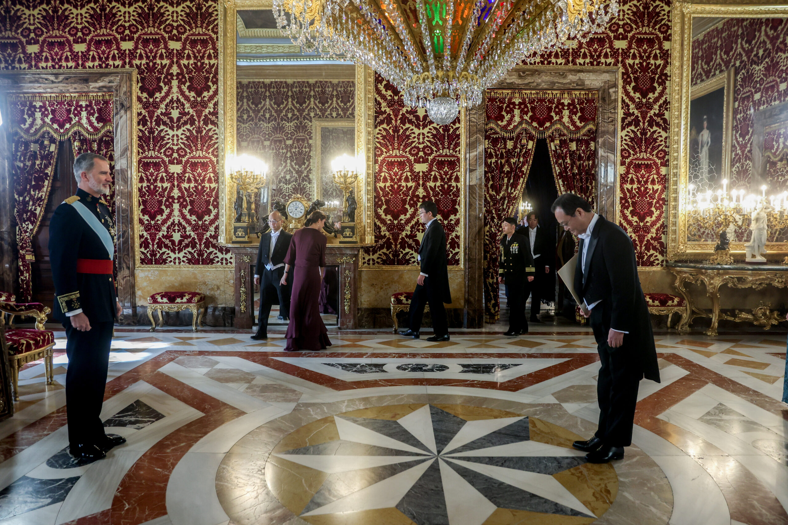 A su llegada al Palacio, son recibidos por la banda de música de la Guardia Real en el Patio de la Armería, que interpreta los himnos de sus respectivos países. Felipe VI, además de recibir los documentos acreditativos, mantiene con todos ellos por separado un breve encuentro.