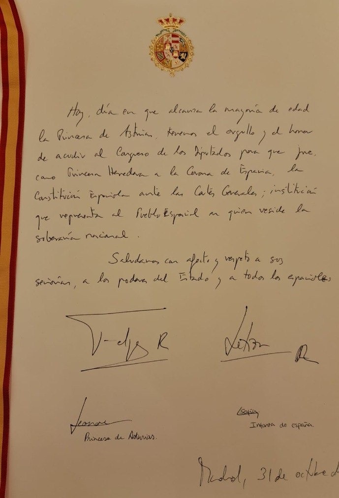 «Hoy, día en que alcanza la mayoría de edad la Princesa de Asturias, tenemos el orgullo y el honor de acudir al Congreso para que jure, como princesa heredera a la Corona de España, la Constitución Española ante las Cortes Generales; institución que representa al Pueblo Español, en quien reside la soberanía nacional», ha dejado escrito.