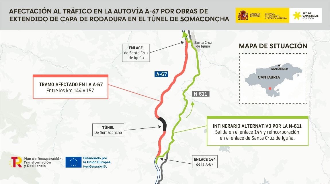 La actuación del Mitma se enmarca en las obras de modernización y mejora de seguridad de los túneles de Gedo, Somaconcha, Lantueno, Las Caldas, Riocorvo y Pedredo, situados en la autovía A-67 y la carretera N-611, en Cantabria. Esta actuación cuenta con un presupuesto de 31,3 millones de euros (IVA incluido), financiado por el Plan de Recuperación, Transformación y Resiliencia (PRTR).