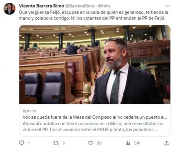 «Que vergüenza Feijó, escupes en la cara de quién es generoso, te tiende la mano y colabora contigo. Ni los votantes del PP entienden al PP de Feijó (sic)», ha expresado en una publicación en la red social X, en la que adjunta una noticia sobre la ausencia de Vox en la Mesa del Congreso tras la falta de acuerdo del PP.