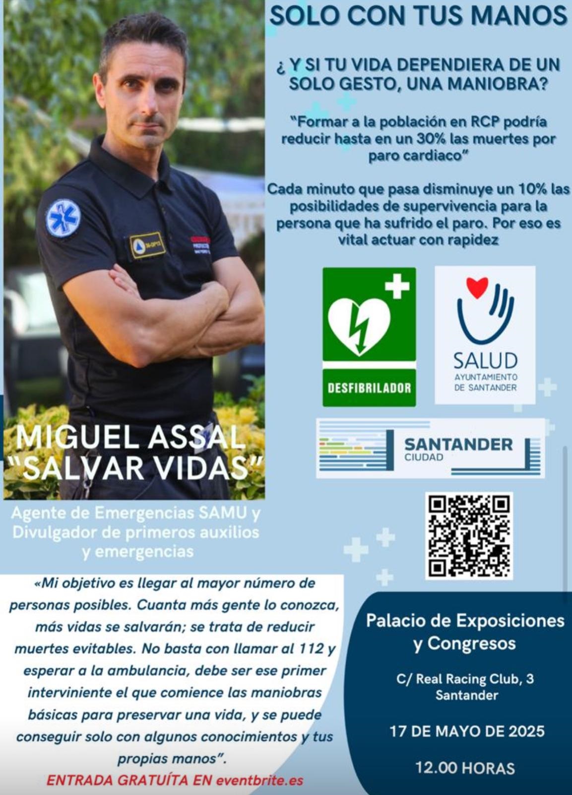 El Ayuntamiento de Santander, a través de la Concejalía de Salud y en el marco del Plan Municipal de Cardioprotección, ha organizado para el próximo sábado 17 de mayo, a las 12.00 horas, una jornada de divulgación sobre soporte vital básico a cargo del agente de Emergencias y youtuber, el cántabro Miguel Assal.