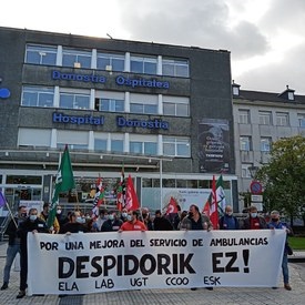 Los sindicatos ELA, LAB, UGT, CCOO y ESK se han concentrado este martes frente al Hospital Donostia de San Sebastián para denunciar que el Gobierno Vasco «sigue suprimiendo el servicio de ambulancias de Osakidetza con otros 20 despidos».