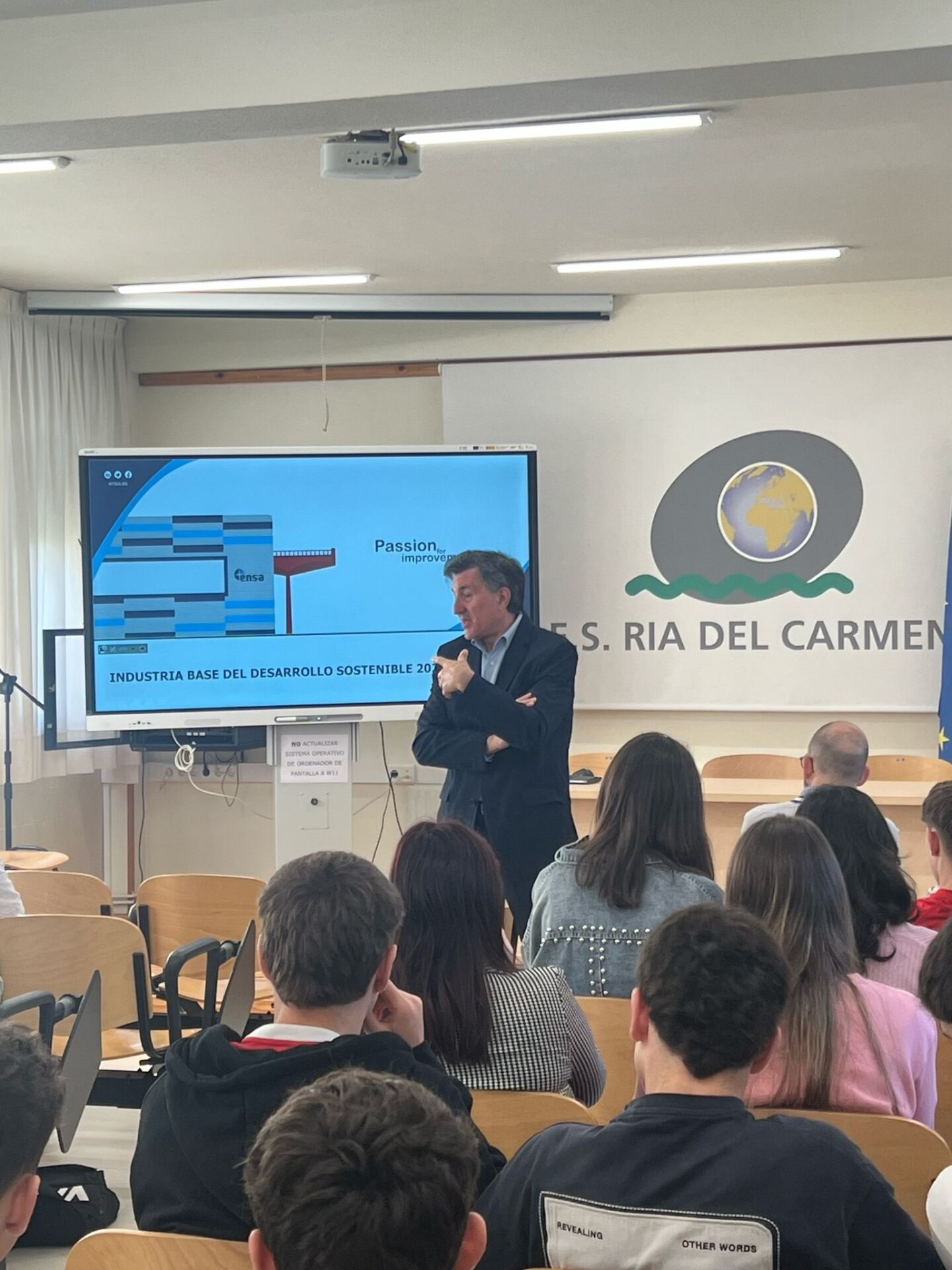 En su intervención ante cerca de medio centenar de alumnos de Educación Secundaria, el presidente de ENSA ha reiterado la importancia del bienestar psicológico y emocional de los trabajadores de cualquier empresa. «El bienestar de la plantilla en una empresa es fundamental. También es muy importante tener una economía sólida justa y moderna que permita eficientemente ofrecer salarios dignos y proveer recursos que cuiden el medio ambiente» ha señalado en su intervención ante los estudiantes del IES Ria del Carmen.
