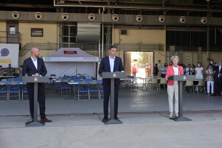 A la visita de Sánchez, Von der Leyen y Michel al campamento temporal para desplazados afganos se han sumado también el alto representante de Política Exterior de la UE, Josep Borrell, los ministros de Asuntos Exteriores, Unión Europea y Cooperación, José Manuel Albares, y el ministro de Inclusión, Seguridad Social y Migración, José Luis Escrivá.