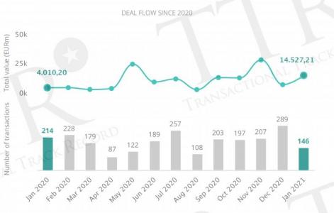 El mercado transaccional español registró 146 operaciones en enero, un 32% menos en tasa interanual, con un importe agregado de 14.527,21 millones de euros, que supone un aumento del 262,26% en el capital movilizado, según el informe mensual de TTR.