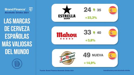 Por su parte, Mahou, la segunda marca de cerveza más valiosa de España, ha ascendido siete plazas en la clasificación mundial tras elevar un 3,8% su valor de marca, mientras que San Miguel se estrena en la clasificación, cerrando el podio nacional tras incrementar su valor de marca un 14,9% en este contexto, ganando nueve plazas para situarse en el puesto 44.