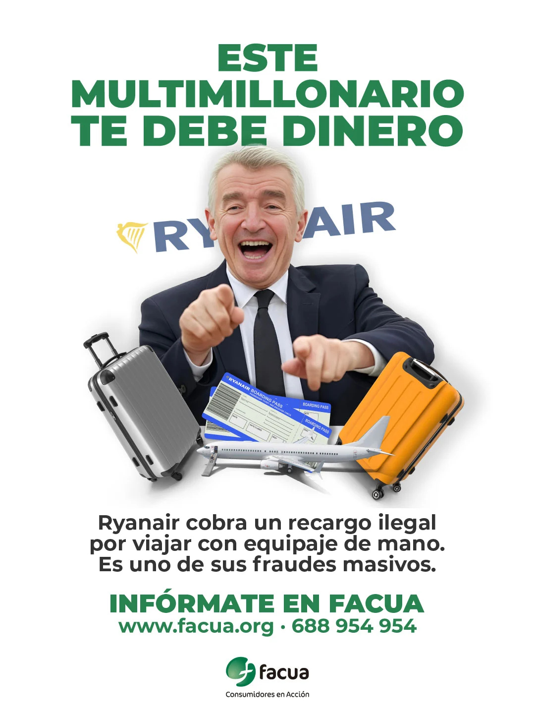 La organización destaca que Ryanair es la aerolínea más denunciada por los usuarios en el último año. Por eso, la campaña se compone de un cartel donde O Leary se ríe delante del logo de la aerolínea con el texto Ryanair cobra un recargo ilegal por viajar con equipaje de mano. Es uno de sus fraudes masivos .