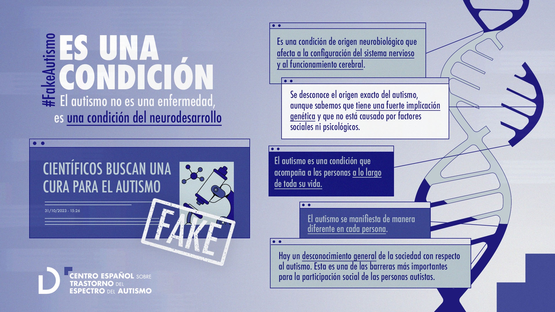 Bajo el paraguas del autismo falso o Fake Autismo se presentan una serie de bulos que serán desmentidos por personas con autismo. En la campaña los protagonistas cuentan cuál es la realidad que se esconde detrás de cada contenido falso, empezando por la esencial que es que «el autismo no es una enfermedad, sino una condición del neurodesarrollo».