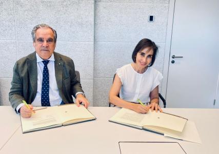 El presidente del Consejo General de Colegios Farmacéuticos, Jesús Aguilar, y la presidenta de la Fundación Piel Sana, de la Academia Española de Dermatología y Venerología, Yolanda Gilaberte, han suscrito este martes un convenio marco con el fin de poner en marcha acciones conjuntas.