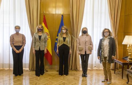 La presidenta de FEDEPE, Ana Bujaldón, acompañada por Carmen Sarmiento y Elsa González, miembros de la Junta Directiva de la Federación Española de Mujeres Directivas, Ejecutivas y Empresarias (FEDEPE), han mantenido este viernes 19 de febrero una reunión con la ministra de Trabajo y Economía Social, Yolanda Díaz, para analizar el impacto de la pandemia sobre las mujeres en el mercado laboral.