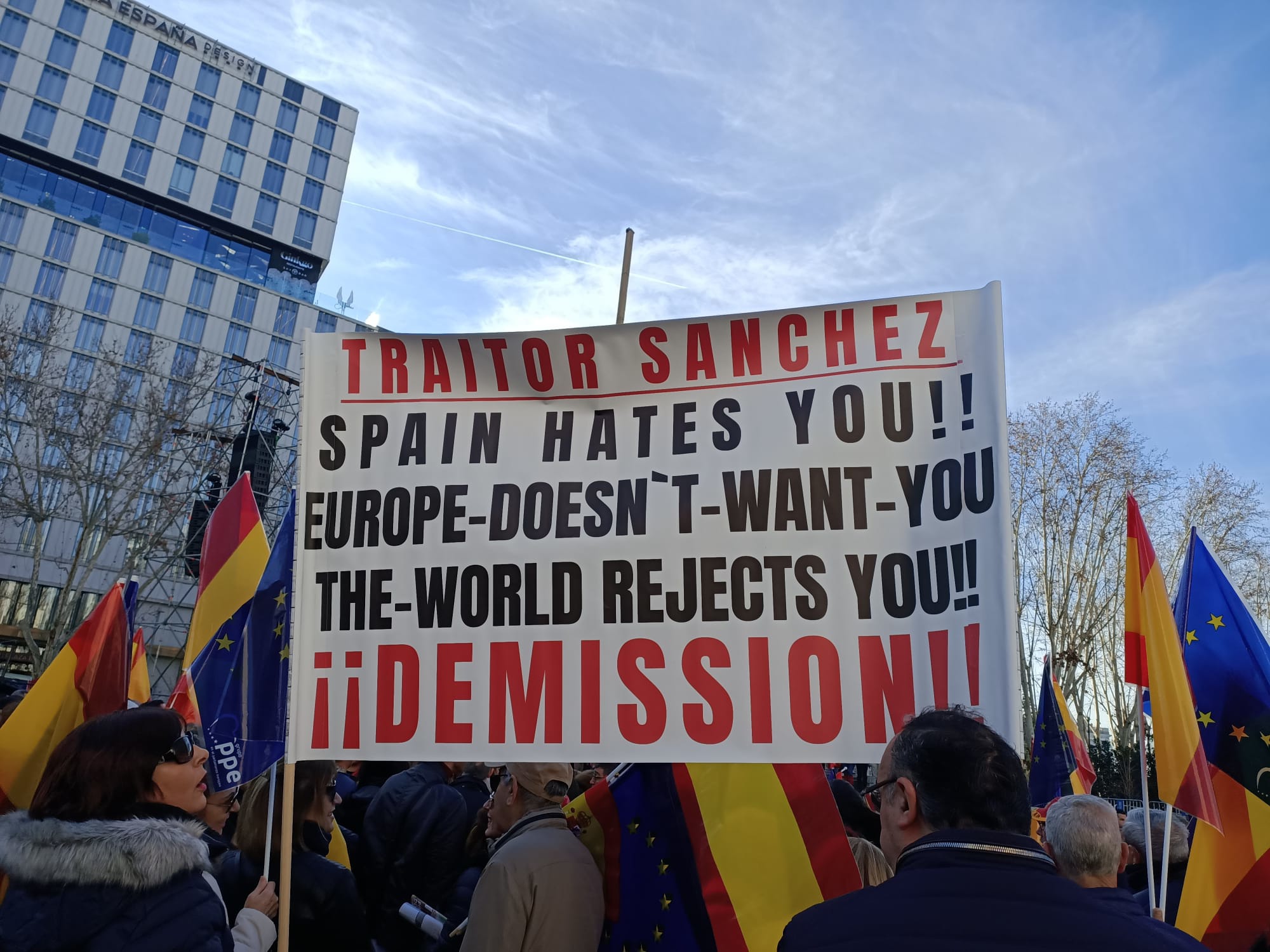 «Esto se va a frenar en Europa», aseguran fuentes del equipo de Feijóo, que presumen además de la «potencia» que tienen las imágenes de las últimas movilizaciones del PP que abrieron muchos medios de comunicación y que han llegado también a Bruselas. En la última protesta del pasado domingo en la Plaza de España de Madrid se vieron algunas pancartas con eslóganes en inglés, como la de Traitor Sánchez. ¡Demission!.