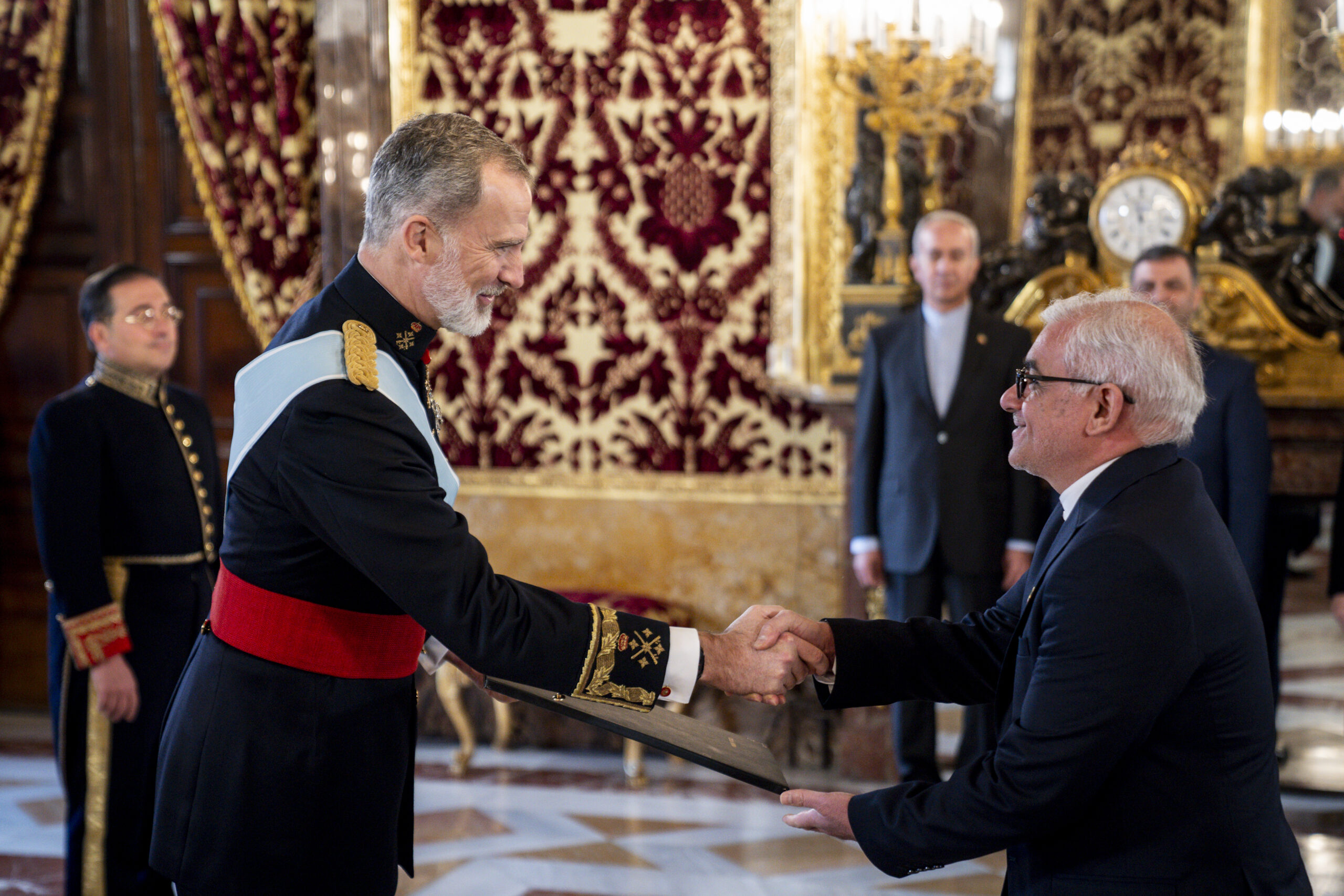 La tradicional ceremonia, que se remonta al siglo XVIII, ha tenido lugar en el Palacio Real y en ella, como es habitual, el monarca ha estado acompañado por el ministro de Asuntos Exteriores, Unión Europea y Cooperación, José Manuel Albares.