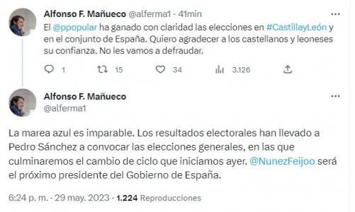 En los mensajes de Twitter, el dirigente popular comienza por insistir en que el Partido Popular ha ganado «con claridad» las elecciones municipales en Castilla y León «y en el conjunto de España», por lo que ha querido agradecer a los castellanos y leoneses su confianza.