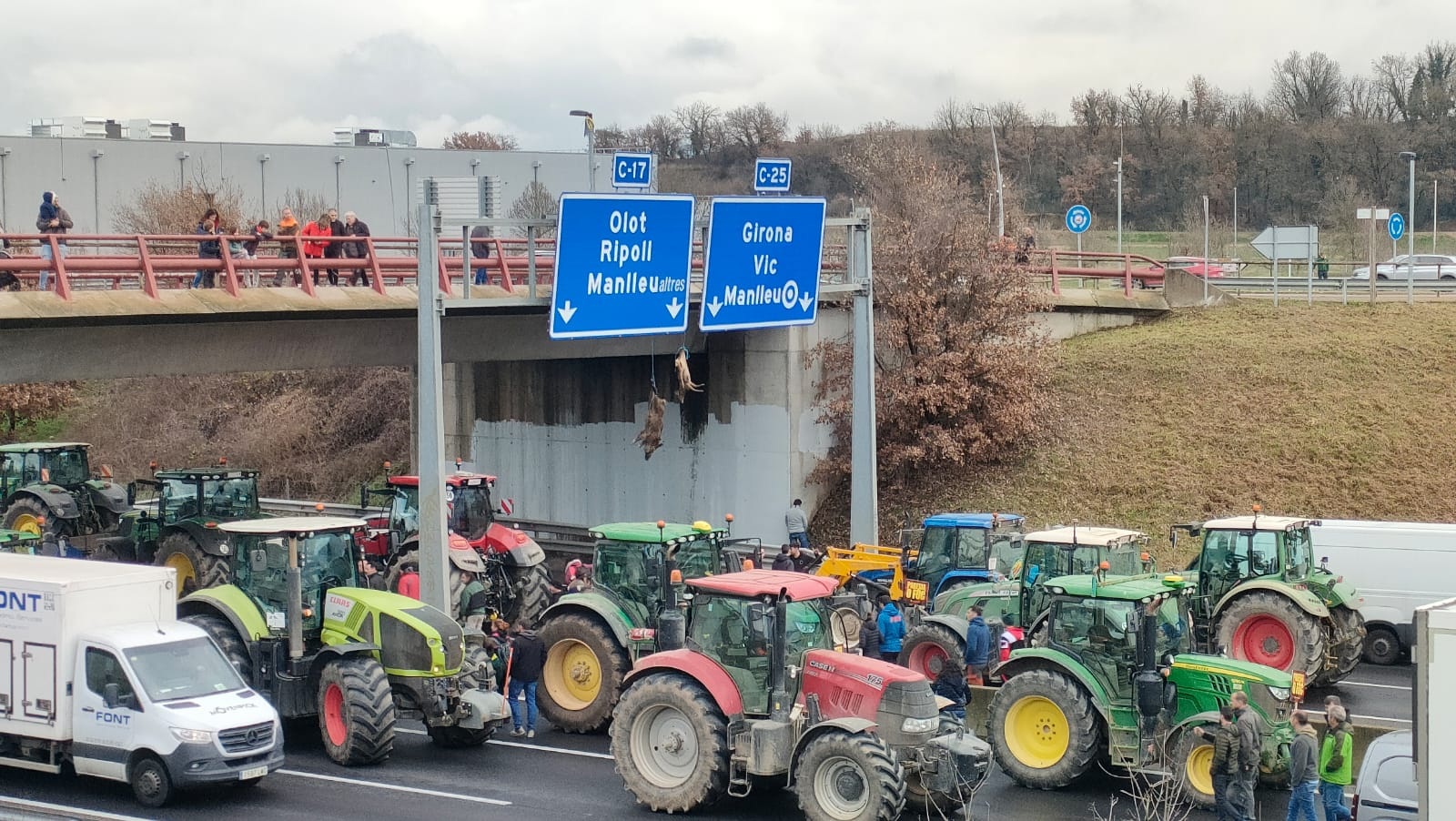 Los agricultores catalanes que están participando este lunes en la tractorada convocada por Unió de Pagesos (UP) han colgado un jabalí y un ciervo muertos en la C-17, a la altura de Gurb (Barcelona), para reclamar a la Generalitat un mayor control de la fauna cinegética.