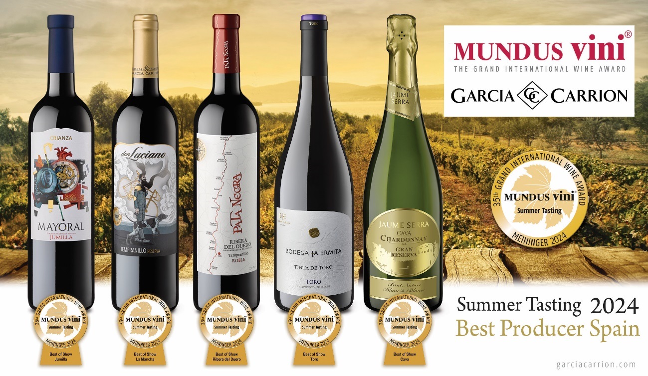 Por último, concretamente, los vinos y cavas de García-Carrión premiados en el Mundus Vini-Summer Tasting 2024 han sido: Mayoral Crianza 2018 (ORO); Bodega La Ermita Toro 2018 (ORO); Mayor de Castilla Reserva 2019 (ORO); Castillo San Simón Crianza 2019 (ORO); Pata Negra Ribera del Duero Roble 2022 (ORO); Viña Arnaiz Ribera del Duero Crianza 2019 (ORO); Marqués de Carrion Crianza 2018 (ORO); Viña Arnaiz Ribera de Duero Reserva 2019; (ORO); Cava Jaume Serra Gran Reserva Chardonnay 2021 (ORO); Pata Negra Ribera del Duero Reserva 2019 (ORO); Pata Negra Rioja Crianza 2018 (ORO); Bodega La Ermita Ribera del Duero 2019 (ORO); Pata Negra Valdepeñas Cepas Viejas Reserva 2018 (ORO); Pata Negra Rueda Sauvignon Blanc 2023 (ORO) y Castillo San Simón 12 meses barrica 2020 (ORO).