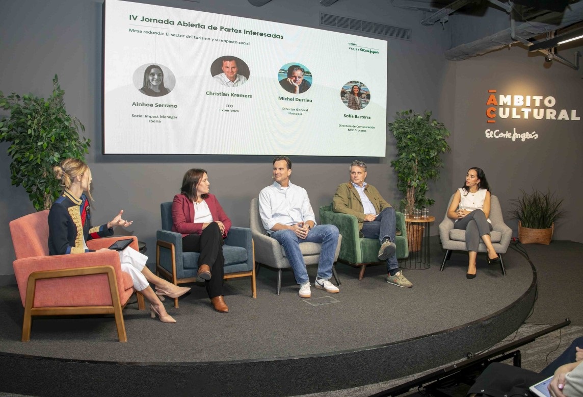 La segunda mesa, titulada El sector del turismo y su impacto social , reunió a Ainhoa Serrano, Social Impact Manager de Iberia; Christian Kremers, CEO de Tu Experiencia; Michel Durrieu, director general de Huttopia; y Sofía Basterra, directora de Comunicación de MSC Cruceros.