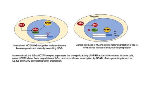 Normalmente, NF-kB se precipita al núcleo e inicia la transcripción de muchos genes cancerígenos, y luego IkB-a la detiene. Cuando HOXA5 está presente, es capaz de ayudar a IkB-a a suprimir la actividad de NF-kB con más potencia, pero cuando HOXA5 se pierde, el efecto de IkB-a sobre NF-kB disminuye, y el potencial de desarrollo de cáncer es mayor.