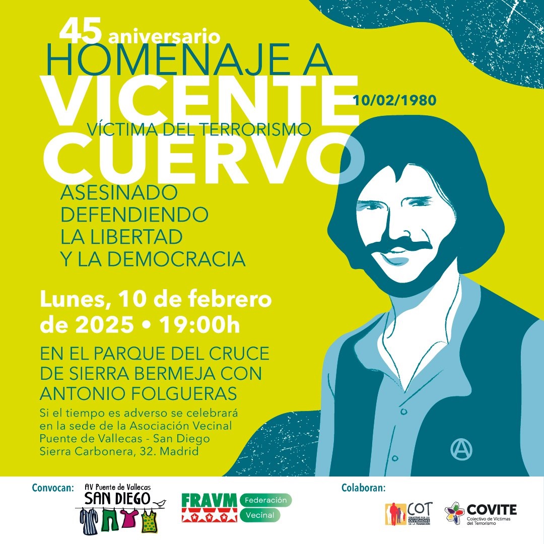 Este recuerdo se realizará en colaboración con la familia de Vicente Cuervo, el Colectivo de Víctimas del Terrorismo (COVITE) y el Colectivo por los Olvidados de la Transición (COT) para conmemorar el 45º aniversario del asesinato del joven vallecano, ha informado la FRAVM en un comunicado.