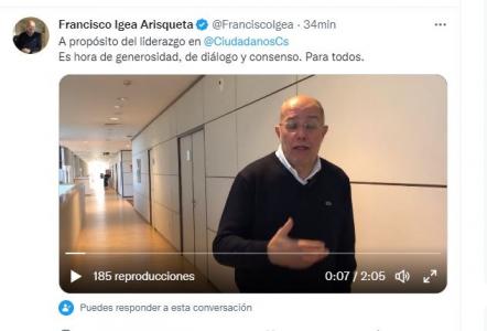 Así lo ha manifestado Igea en un vídeo que ha publicado en su cuenta de Twitter donde ha explicado que lleva tiempo insistiendo, como así se lo ha dicho a la actual presidenta de Cs, Inés Arrimadas, en que ha llegado el momento «de dejar paso a otras personas, a un liderazgo más renovado», y cree que hay que hacerlo «con tranquilidad, normalidad, diálogo y consenso».