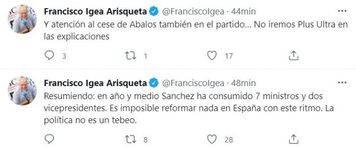 El vicepresidente de la Junta de Castilla y León, Francisco Igea, ha reaccionado a la reforma del Ejecutivo llevada a cabo este sábado por el presidente del Gobierno, Pedro Sánchez, y ha recapitulado que «en año y medio Sánchez ha consumido siete ministros y dos vicepresidentes».