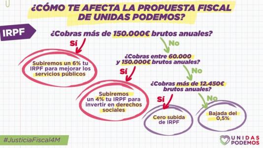 Unas medidas, con la que la formación de Pablo Iglesias recaudar aproximadamente 1.000 millones de euros adicionales, que la formación pretende implantar porque actualmente la Comunidad de Madrid «es la única de toda España en la que absolutamente nadie paga el impuesto de patrimonio».