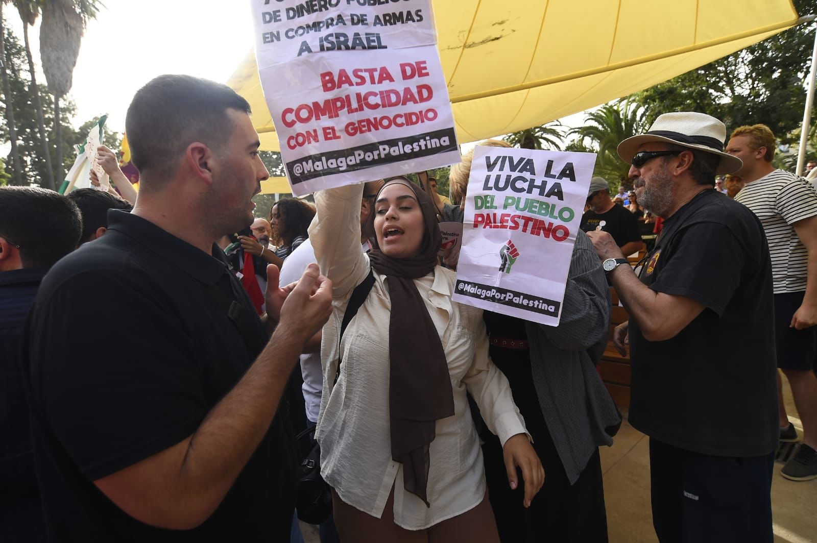 Algunas de las personas que han irrumpido en el acto portaban carteles con el lema Basta ya de complicidad con el genocidio. @Malaga con Palestina y Viva la lucha del pueblo palestino , junto con banderas palestinas.