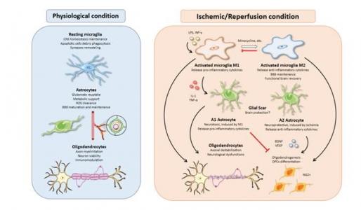 Tras la isquemia, la activación tanto de la microglía como de los astrocitos, presenta una dualidad funcional. Por una parte, pueden adquirir una función neurotóxica e inflamatoria (fenotipo M1/A1), y por otra pueden presentar una función neuroprotectora y anti-inflamatoria (fenotipo M2/A2).