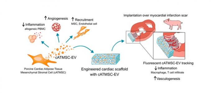 Investigadores del CIBERCV, del grupo de investigación ICREC en enfermedades cardiovasculares, en el Instituto de Investigación Germans Trias i Pujol (IGTP), liderado por Antoni Bayés-Genís, han demostrado que se puede inducir la regeneración del músculo cardiaco con la aplicación de vesículas extracelulares (EV, por las siglas en inglés) en un bioimplante, sin añadir células.