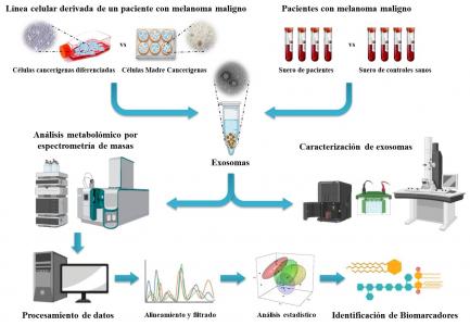 Este trabajo se centró en la caracterización a nivel molecular de exosomas producidos por CMCs y aislados en sangre de pacientes con melanoma maligno, mediante técnicas metabolómicas, disciplina que estudia el conjunto de moléculas de los sistemas biológicos, con el fin de encontrar posibles biomarcadores para el diagnóstico de esta enfermedad.