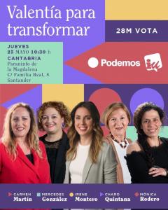Junto a Montero, secretaria de Acción de Gobierno de Podemos, estará en el acto la líder de Podemos Cantabria, Mercedes González; la candidata de la coalición Podemos-IU a la Presidencia de Cantabria, Mónica Rodero, y las número 2 de la lista autonómica y la del Ayuntamiento de Santander, Carmen Martín (IU) y Charo Quintana, respectivamente.