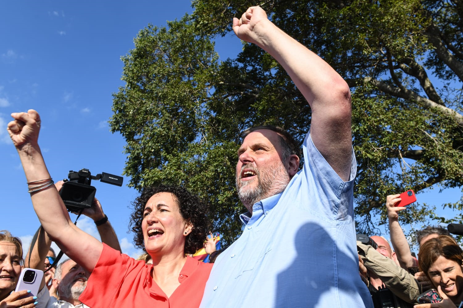 Junqueras y Rovira se han reencontrado en Cantallops (Girona), donde se han abrazado largamente, junto con otros dirigentes independentistas y todos han coreado a su alrededor Independencia .