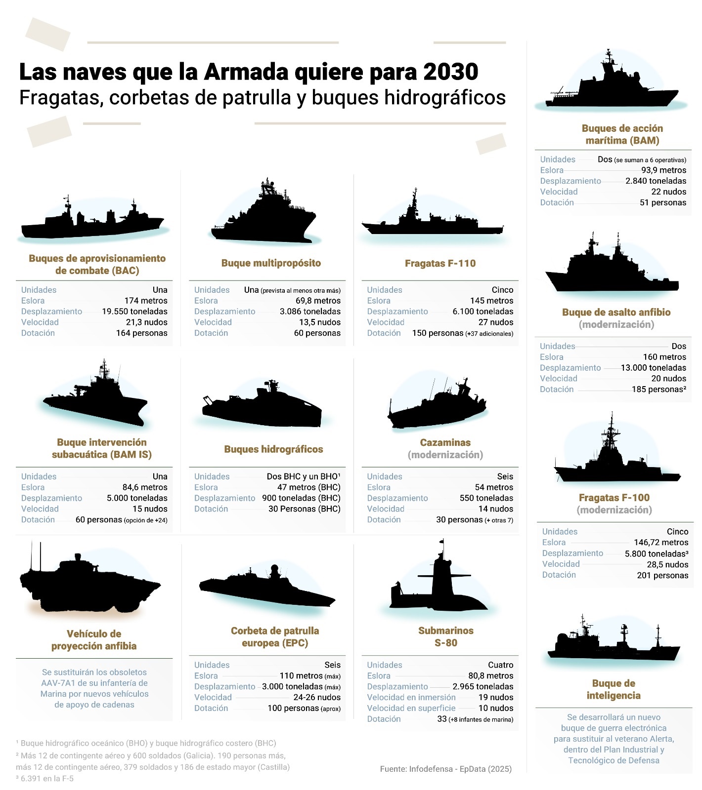 Asimismo, la Armada modernizará las cinco fragatas F-100, que siguen siendo la columna vertebral de la fuerza naval en el ámbito de la defensa antiaérea; seis cazaminas de la clase Segura para garantizar su operatividad hasta 2040; y los dos buques de asalto anfibio Galicia y Castilla , que ya llevan en servicio 27 y 25 años, respectivamente.