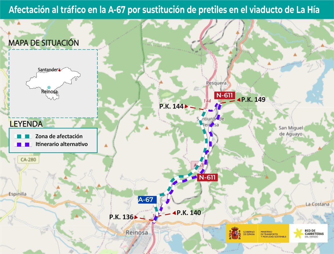 El Ministerio de Transportes y Movilidad Sostenible va a acometer las obras de sustitución del sistema de contención de vehículos (pretiles) del viaducto de La Hia, en la calzada sentido Santander de la autovía A-67 (kilómetro 139,800), para lo que se procederá al corte total al tráfico de la calzada derecha sentido Santander, entre los enlaces de Reinosa Norte (km 136) hasta el enlace de Santiurde (km 144) desde este lunes 20 de enero hasta principios de abril.