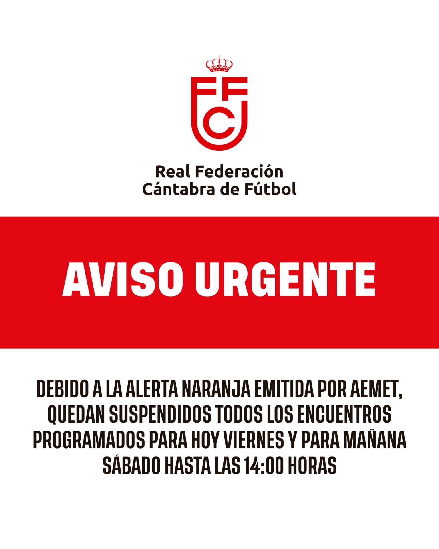 La Federación Cántabra de Fútbol ha suspendido todos los partidos que estaban programados para este viernes y los previstos hasta las 14.00 horas del sábado 14 por el temporal.