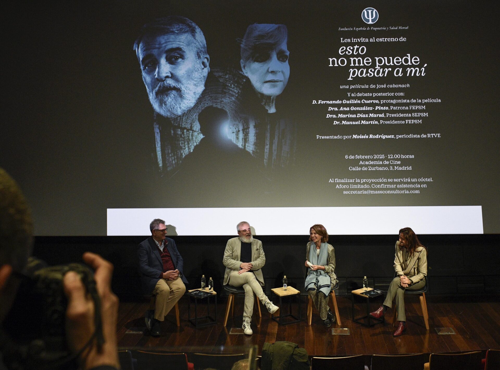 La presentación ha contado con sus actores principales, Fernando Guillén Cuervo y Andrea Bronston y la directora médica del proyecto, Ana González Pinto; también han asistido miembros de la FEPSM y de la Sociedad Española de Psiquiatría y Salud Mental (SEPSM), quienes han debatido en una mesa redonda junto con la presidenta de la SEPSM, Marina Díaz Marsá, el presidente de FEPSM, Manuel Martín, Fernando Guillén Cuervo y Ana González Pinto.