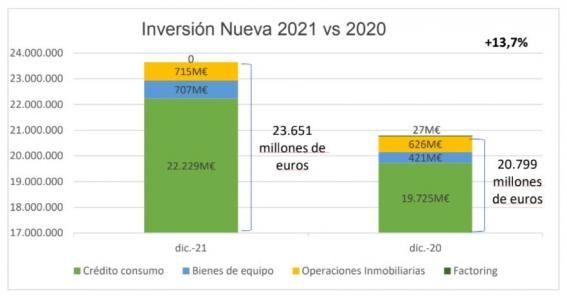 En lo relativo a la inversión viva, que mide las operaciones en curso, el importe creció en 2021 un 1,7%, hasta los 31.004 millones de euros. Por categorías, la inversión viva en crédito al consumo alcanzó los 19.471 millones de euros, seguido por la inversión viva en financiación de inmuebles, hasta 10.293 millones de euros, y por la inversión viva en financiación de bienes de equipo, hasta los 1.224 millones de euros.