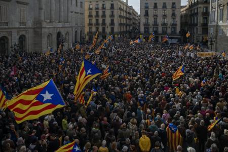 La protesta ha empezado sobre las 12.10 en el Pla de Palau, con la pancarta principal Ningún pacto con España para encarcelarnos. ¡Independencia ahora! .