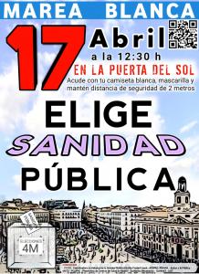 La Marea Blanca, que agrupa diversas organizaciones sociales, sindicales, vecinales, ciudadanas, colectivos y plataformas, llevará a cabo una concentración en la Puerta del Sol, frente a la sede de la Presidencia de la Comunidad de Madrid este sábado, a las 12.30 horas, bajo el lema Elige Sanidad Pública .