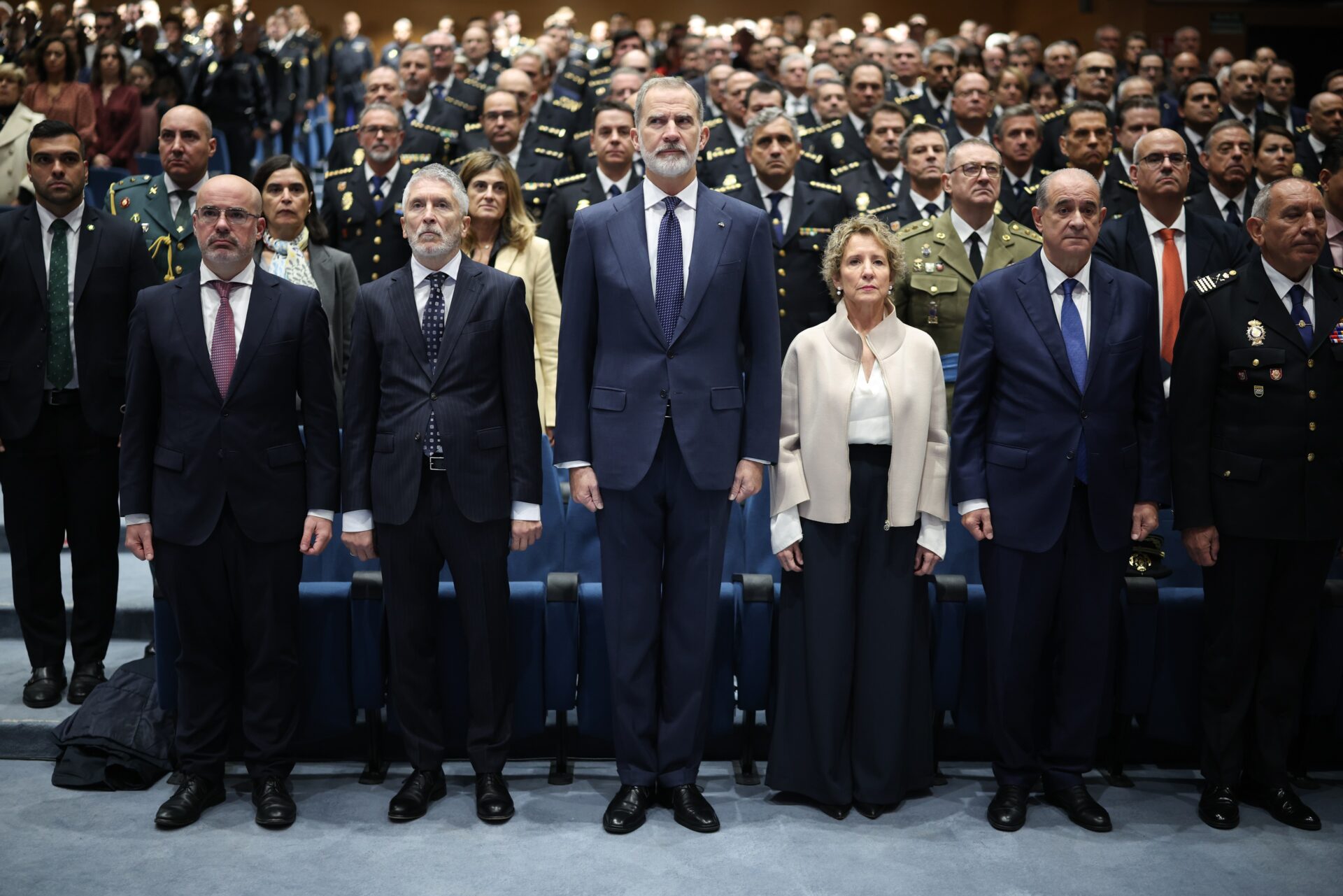 En el acto celebrado en el Complejo Policial de Canillas (Madrid), el Rey ha estado acompañado por el ministro del Interior, Fernando Grande-Marlaska; la secretaria de Estado de Seguridad, Aina Calvo; el delegado del Gobierno en Madrid, Francisco Martín; y el director general de la Policía, Francisco Pardo, entre otras autoridades.