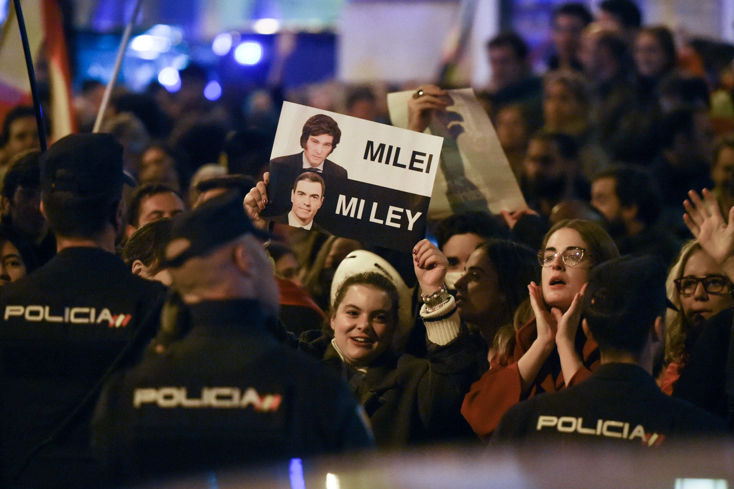 Los manifestantes portaban banderas de España, franquistas y carlistas, además de carteles en contra de Sánchez, de Puigdemont y del Partido Comunista. Como en noches anteriores, también han aparecido banderas de Revuelta , la asociación juvenil que ha convocado además una huelga estudiantil para este viernes 24 de noviembre para protestar contra la amnistía y el nuevo Gobierno de coalición.