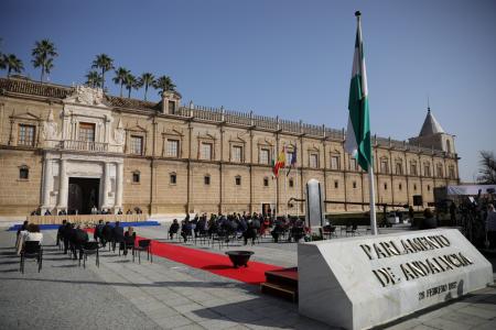 Debido a las restricciones sanitarias, todo el desarrollo del acto, incluido el discurso de la presidenta, ha tenido lugar ante la fachada principal del antiguo Hospital de las Cinco Llagas –sede del Parlamento–, y al mismo han asistido exclusivamente los diputados autonómicos y el Consejo de Gobierno de la Junta de Andalucía, de manera que no se han cursado las habituales invitaciones para la conmemoración del 28F.