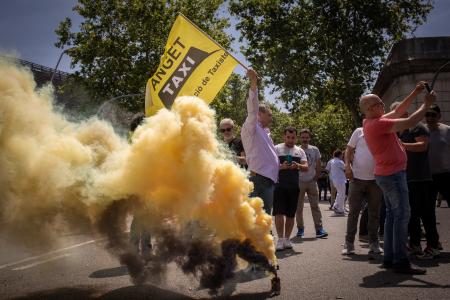 Los manifestantes han lanzado proclamas a favor de «echar» a los conductores de las VTC de Cataluña, han detonado petardos y encendido botes de humo.