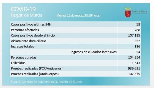 La cifra de nuevos casos de coronavirus en la Región de Murcia se ha situado en 58 en las últimas 24 horas, en una jornada en la que ha fallecido una persona por Covid-19. Se trata de un varón de 83 años de Murcia.
