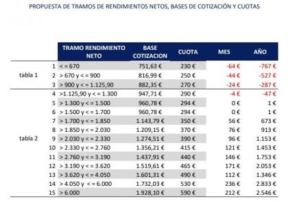 Los 15 tramos del Gobierno arrancan con los rendimientos netos inferiores a 670 euros, con una cuota de 230 euros; para los autónomos que ingresan entre 670 euros y 900, la cuota se fija en 250 euros. En el caso de los trabajadores por cuenta propia con rendimientos mayores de 900 euros e inferiores a 1.125,90, el Gobierno propone una cuota de 270 euros.