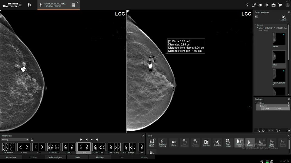 Este sistema y su función de mamografía por contraste (CEM), que es una técnica de imagen morfofuncional que utiliza agente de contraste yodado intravenoso y mamografía adquirida con energía dual, permite una rápida identificación de posibles cánceres y descarta lesiones no concluyentes evitando el exceso de tiempo y coste de una resonancia magnética.