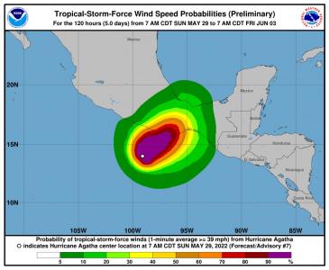 «En la trayectoria pronosticada, el centro de Ágatha se aproximará al sur de la costa de México más tarde hoy (domingo) y tocará tierra el lunes», ha explicado el organismo, con sede en Miami.