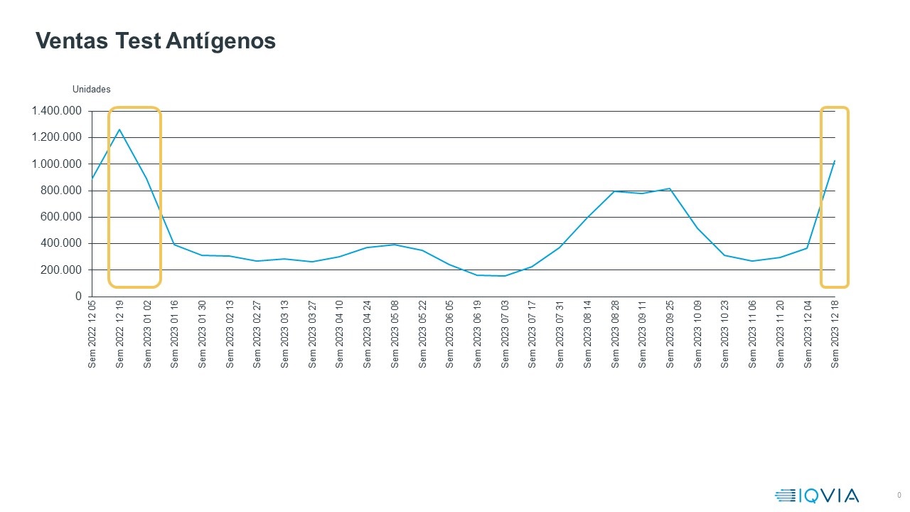 Este nivel de ventas triplica lo que se vendió en la primera semana de diciembre de este 2023 (300 mil versus 1 millón).Si se comparan estas cifras con las del año 2022 (un millon en 2023 frente a 1.3 millón en 2022) esto supone una caída del 20 por ciento respecto a las ventas de la misma semana del año pasado, lo cual indica un comportamiento más habituado a convivir con el virus por parte de la población y una percepción de la enfermedad como menos letal.